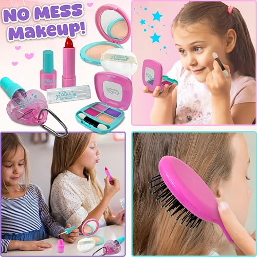 - REALISTIC ACCESSORIES WITHOUT THE MESS: Features pretend cosmetics such as lipstick, compact powder, an eye shaddow palette, and nail polish, all completely fake causing no mess whatsoever. The smartphone, smartwatch and car key have no function and no batteries, giving your kids the joyful and safe play experience while preserving for yourself a noiseless environment.